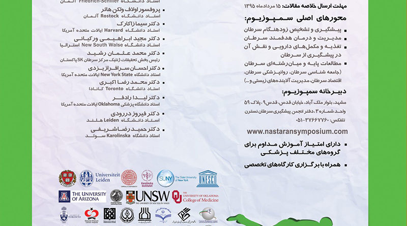 دومین سمپوزیوم بین المللی سرطان نسترن، ۷ تا ۸ مهر ۱۳۹۵ توسط مرکز پیشگیری سرطان نسترن – دانشگاه پزشکی مشهد و دانشگاه فردوسی در شهر مشهد برگزار می شود.