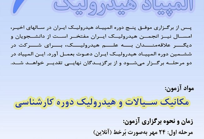 پس از برگزاری موفق پنج دوره المپیاد هیدرولیک ایران در سالهای اخیر، امسال نیز انجمن هیدرولیک ایران مفتخر است از دانشجویان و دیگر علاقهمندان به علم هیدرولیک ایران شرکت در پنجمین دوره المپیاد هیدرولیک ایران دعوت به عمل آورد. این المپیاد در دو مرحله برگزار خواهد شد و از برگزیدگان نهایی تقدیر به عمل خواهد آمد.