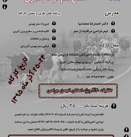کارگاه آموزشی “اصلاح سم در گاو شیری” زیر نظر آقای دکتر احمدرضا محمدنیا در تاریخ ۲۵-۲۴ آذرماه ۱۳۹۵ برگزار خواهد شد.