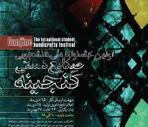 اولین جشنواره ملی دانشجویی صنایع دستی گنجینه به همت دانشجویان و هنرمندان دانشگاه هنر برای نخستین بار در ایران برگزار خواهد شد. این جشنواره که در شش گرایش چوب، شیشه، فلز،سفال ، بافت و نگارگری برگزار میشود،در نظر دارد با ایجاد فضای رقابتی و علاقه مند کردن دانشجویان به خلق آثار هنری ، ارتقا سطح کیفی محصولات و ارتقا سطح علمی دانشجویان صنایع دستی و همچنین ایجاد فضای پژوهشی موجب شکست رکود و سکون فضای آکادمیک و مسبب پویایی دانشجویان و هنرجویان صنایع دستی شود.