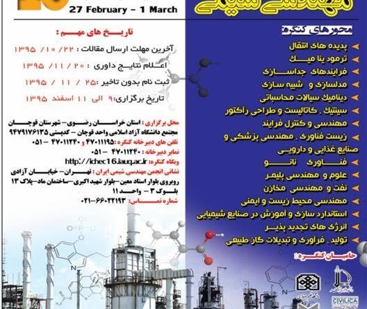شانزدهمین کنگره مهندسی شیمی، ۹ تا ۱۱ اسفند ۱۳۹۵ توسط دانشگاه آزاد اسلامی واحد قوچان در شهر قوچان برگزار می شود.