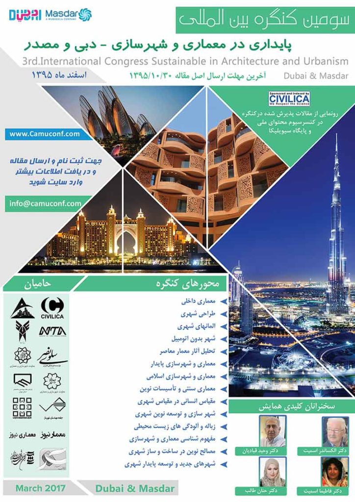 سومین کنگره بین المللی پایداری در معماری و شهرسازی – دبی و مصدر، ۲۲تا ۲۳ اسفند ۱۳۹۵ توسط دانشگاه آزاد اسلامی واحد امارات – انجمن معماری شهرسازی استان البرز جامعه مهندسان شهرساز- موسسه بناشهر پایدار- کانون معماری ایران در دانشگاه آزاد اسلامی واحد امارات (دبی) برگزار می شود.