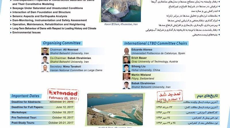 چهارمین کنفرانس بینالمللی رفتار بلندمدت و فنآوریهای نوسازی سازگار با محیط زیست سدها، ۲۵ تا ۲۷ مهر ۱۳۹۶ توسط کمیته ملی سدهای بزرگ ایران در شهر تهران برگزار می شود.