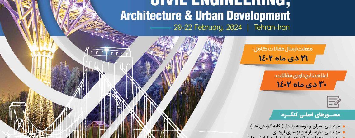 نهمین دوره کنگره سالانه بین المللی عمران، معماری و توسعه شهری به عنوان بزرگترین، معتبرترین، منظم ترین و با سابقه ترین گردهمایی شناخته شده سالانه علمی، پژوهشی و اجرایی حوزه عمران، معماری، شهرسازی و محیط زیست خاورمیانه در کشور ایران در تاریخ ۱ الی ۳ اسفند ماه ۱۴۰۲ با مجوز رسمی برگزاری از وزارت علوم، تحقیقات و فناوری به شماره ۷۲۶۴۰۳۸ و با شرکت بیش از ۳۵۰۰ نفراز فعالین این عرصه شامل دانشگاهیان، صاحب نظران، سیاستگزاران و مدیران، دانشجویان ، سازمان های ذی ربط و علاقه مند، مهندسین مشاور، پیمانکاران و متخصصان از کشورهای مختلف جهان با همکاری دانشگاه ساپینزا رم، دانشگاه شیراز، دانشگاه علم و صنعت ایران، دانشگاه مراغه، دانشگاه هنر اسلامی تبریز، دانشگاه کوثر، انجمن مهندسی رودخانه ایران و سایر دانشگاه های برجسته ایران و ایتالیا در شهر تهران برگزار میگردد. این کنگره در نظر دارد با معرفی توان علمی و کاربردی برای ارتقای سطح کیفی معماری، سازه و توسعه های شهری و همچنین بررسی نیازمندی و ضرورتهای آموزش موارد فوق گام برداشته و با شناسایی نگرشها، تجربیات نوین و تحلیل ابعاد نظری و کاربردی توسعه شهری، به تحلیل ،آموزش و پژوهش آن بپردازد. برگزاری این کنگره همه ساله با شعار “توسعه شهری راهی به سوی توسعه آینده” فرصتی برای گردهمایی صاحبنظران،متخصصان واندیشمندان درحوزه معماری، سازه وتوسعه شهری بوده است.