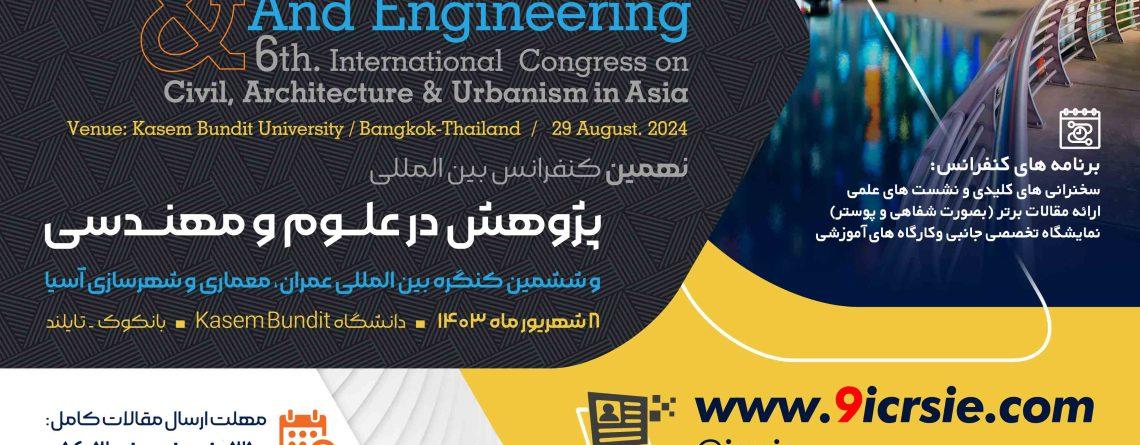 نهمین کنفرانس بین المللی پژوهش در علوم و مهندسی و ششمین کنگره بین المللی عمران، معماری و شهرسازی آسیا به عنوان یکی از معتبرترین و منظم ترین گردهمایی های سالانه علمی، پژوهشی و اجرایی حوزه علوم مهندسی، علوم، علوم انسانی و عمران، معماری و شهرسازی آسیا در کشور تایلند و دانشگاه Kasem Bundit بانکوک بوده که به صورت دو کنفرانس مجزا ۸ شهریور ماه ۱۴۰۳ با شرکت فعالین این عرصه شامل دانشگاهیان، صاحب نظران، سیاستگزاران و مدیران، دانشجویان، سازمان های ذی ربط و علاقه مند، مهندسین مشاور، پیمانکاران و متخصصان از کشورهای مختلف جهان به صورت حضوری در دانشگاه Kasem Bundit بانکوک برگزار خواهد گردید. این کفرانس تحت تایید تمام دانشگاه ها، سفارتخانه ها و سازمان های وابسته جهان می باشد و همچنین تمام مقالات پذیرفته شده آن نیز علاوه بر چاپ در کتاب و مجموعه مقالات کنفرانس در سایت های معتبر تایلند، ایران و جهان نمایه می گردند.