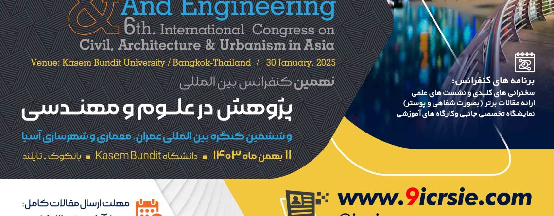 نهمین کنفرانس بین المللی پژوهش در علوم و مهندسی و ششمین کنگره بین المللی عمران، معماری و شهرسازی آسیا به عنوان یکی از معتبرترین و منظم ترین گردهمایی های سالانه علمی، پژوهشی و اجرایی حوزه علوم مهندسی، علوم، علوم انسانی و عمران، معماری و شهرسازی آسیا در کشور تایلند و دانشگاه Kasem Bundit بانکوک بوده که به صورت دو کنفرانس مجزا ۱۱ بهمن ماه ۱۴۰۳ با شرکت فعالین این عرصه شامل دانشگاهیان، صاحب نظران، سیاستگزاران و مدیران، دانشجویان، سازمان های ذی ربط و علاقه مند، مهندسین مشاور، پیمانکاران و متخصصان از کشورهای مختلف جهان به صورت حضوری در دانشگاه Kasem Bundit بانکوک برگزار خواهد گردید. این کفرانس تحت تایید تمام دانشگاه ها، سفارتخانه ها و سازمان های وابسته جهان می باشد و همچنین تمام مقالات پذیرفته شده آن نیز علاوه بر چاپ در کتاب و مجموعه مقالات کنفرانس در سایت های معتبر تایلند، ایران و جهان نمایه می گردند.