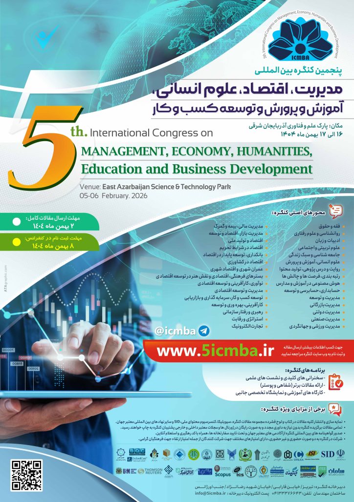 پنجمین کنگره بین المللی مدیریت، اقتصاد، علوم انسانی، آموزش و پرورش و توسعه کسب و کار به عنوان بزرگترین، معتبرترین، منظم ترین و با سابقه ترین گردهمایی شناخته شده سالانه علمی، پژوهشی و اجرایی حوزه مدیریت، اقتصاد، حسابداری، علوم انسانی، آموزش و پرورش و کسب و کار خاورمیانه در کشور ایران در تاریخ ۱۶ الی ۱۷ بهمن ماه ۱۴۰۴ با شرکت بیش از ۲۵۰۰ نفر از فعالین این عرصه شامل دانشگاهیان، صاحب نظران، سیاستگزاران و مدیران، دانشجویان ، فرهنگیان، سازمان های ذی ربط و علاقه مند و متخصصان از کشورهای مختلف جهان با همکاری دانشگاه های برجسته کشور در پارک علم و فناوری آذربایجان شرقی برگزار میگردد. این کنگره در نظر دارد با معرفی توان علمی و کاربردی برای ارتقای سطح کیفی مدیریت، اقتصاد، علوم انسانی و کسب و کار و همچنین بررسی نیازمندی و ضرورتهای آموزش موارد فوق گام برداشته و با شناسایی نگرشها، تجربیات نوین و تحلیل ابعاد نظری و کاربردی مربوطه، به تحلیل، آموزش و پژوهش آن بپردازد.