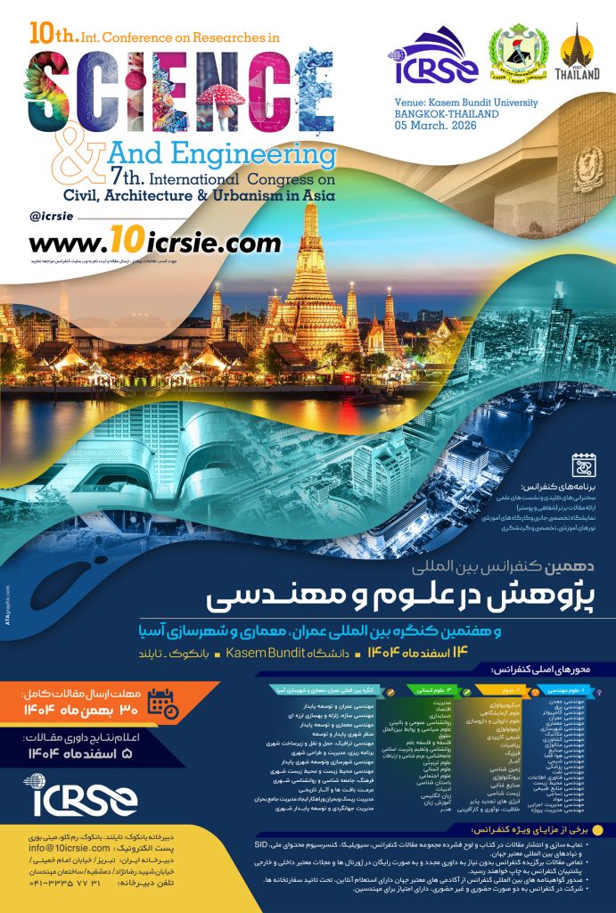 دهمین کنفرانس بین المللی پژوهش در علوم و مهندسی و هفتمین کنگره بین المللی عمران، معماری و شهرسازی آسیا به عنوان یکی از معتبرترین و منظم ترین گردهمایی های سالانه علمی، پژوهشی و اجرایی حوزه علوم مهندسی، علوم، علوم انسانی و عمران، معماری و شهرسازی آسیا در کشور تایلند و دانشگاه Kasem Bundit بانکوک بوده که به صورت دو کنفرانس مجزا ۱۴ اسفند ماه ۱۴۰۴ با شرکت فعالین این عرصه شامل دانشگاهیان، صاحب نظران، سیاستگزاران و مدیران، دانشجویان، سازمان های ذی ربط و علاقه مند، مهندسین مشاور، پیمانکاران و متخصصان از کشورهای مختلف جهان به صورت حضوری در دانشگاه Kasem Bundit بانکوک برگزار خواهد گردید. این کفرانس تحت تایید تمام دانشگاه ها، سفارتخانه ها و سازمان های وابسته جهان می باشد و همچنین تمام مقالات پذیرفته شده آن نیز علاوه بر چاپ در کتاب و مجموعه مقالات کنفرانس در سایت های معتبر تایلند، ایران و جهان نمایه می گردند.