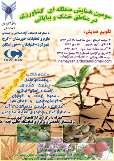 سومین همایش منطقه ای کشاورزی در مناطق خشک و بیابانی 29 بهمن ماه 1392 توسط دانشگاه آزاد اسلامی واحد اردستان و تحت حمایت رسمی سیویلیکا برگزار می شود.