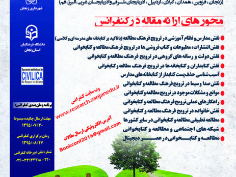 کنفرانس منطقه ای فرهنگ مطالعه و کتابخوانی آسیب شناسی و راهکارها،۲۷ آبان ۱۳۹۵ توسط اداره کل آموزش و پرورش استان زنجان در شهر زنجان برگزار می شود.