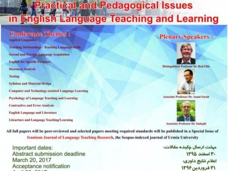 اولین همایش ملی مسائل کاربردی و آموزشی در تدریس و یادگیری زبان انگلیسی، ۴ تا ۵ شهریور ۱۳۹۶ توسط دانشگاه آزاد اسلامی واحد ارومیه در شهر ارومیه برگزار می شود.