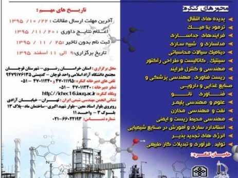 شانزدهمین کنگره مهندسی شیمی، ۹ تا ۱۱ اسفند ۱۳۹۵ توسط دانشگاه آزاد اسلامی واحد قوچان در شهر قوچان برگزار می شود.