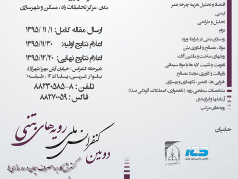 دومین کنفرانس ملی رویه های بتنی ، ۶ تا ۷ اردیبهشت ۱۳۹۶ توسط انجمن بتن ایران و مرکز تحقیقات راه،مسکن و شهرسازی در شهر تهران برگزار می شود.