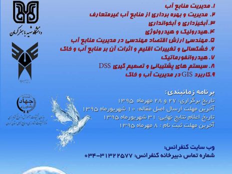 پنجمین کنفرانس مدیریت جامع منابع آب، ۲۷ تا ۲۸ مهر ۱۳۹۵ توسط انجمن مهندسی آبیاری و آب ایران در دانشگاه شهید باهنر کرمان برگزار می شود.
