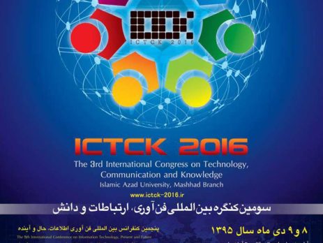 سومین کنگره بین المللی فن آوری، ارتباطات و دانشICTCK2016 در تاریخ ۸ دی ۱۳۹۵ تا ۹ دی ۱۳۹۵ توسط دانشگاه آزاد اسلامی واحد مشهد و تحت حمایت سیویلیکا در شهر مشهد برگزار می شود.